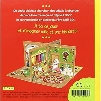 Au premier abord, l'ouvrage s'ouvre comme un livre classique.Sur les rabats, un jeu de « Cherche et trouve » permet à l'enfant d'observer des dizaines de petits éléments (personnages, objets, meubles, vêtements, jouets...) dans les 4 grandes scènes illustrées, représentant les 4 pièces de l'atelier du Père Noël. Mais une fois le livre déplié, en un instant, il se transforme en atelier du Père Noël 3D.Au gré de ses envies, l'enfant choisira de mettre en avant le sol bien rangé ou le sol désordonné... À lui de jouer et d'imaginer mille et une histoires !Pour les 2-5 ans